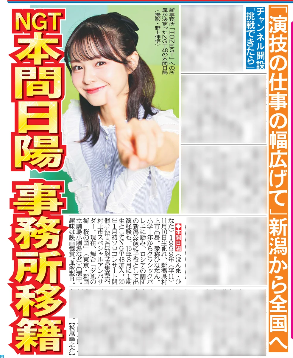 NGT48本間日陽、移籍至藝能事務所HONEST「透過演技的工作增加