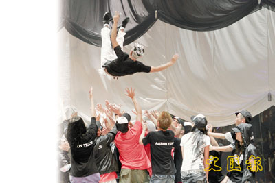 城城演唱會圓滿結束,一眾舞蹈員把他拋到半空,十分高興。