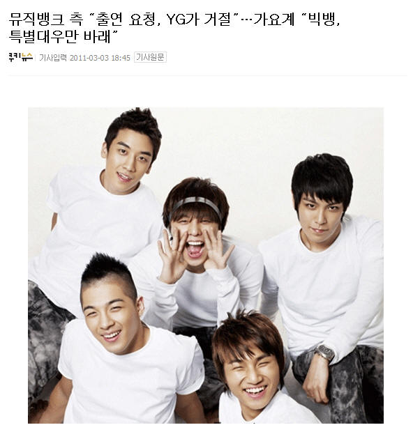 MUSIC BANK表示:YG拒絕了我們的演出邀請...歌謠界:BIGBANG只想著要有特別待遇