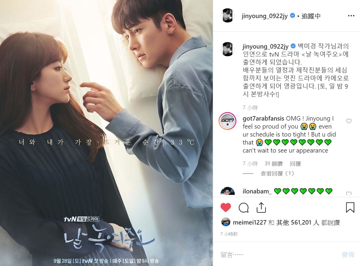 jinyoung_0922jy : 因爲和白美京作家的緣分,所以出演了tvN電視劇《請融化我》