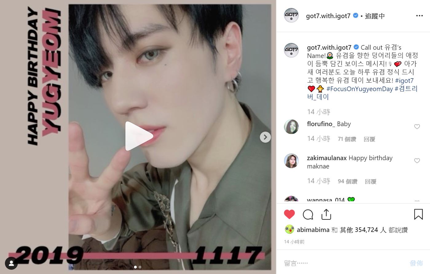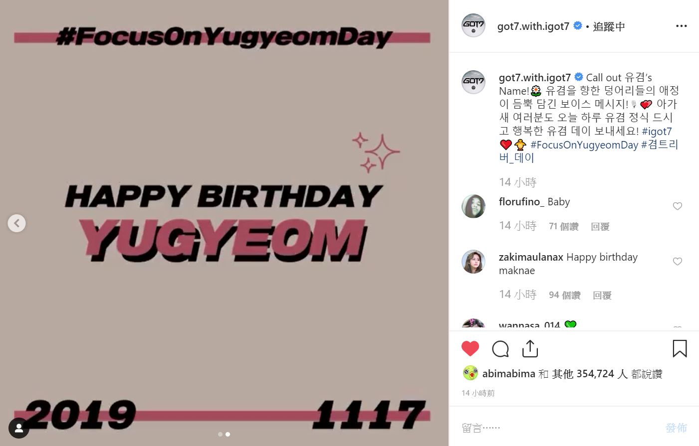 yu_gyeom : #igot7 (愛心)(鳥) 非常感謝您的生日祝福 呦呼!!