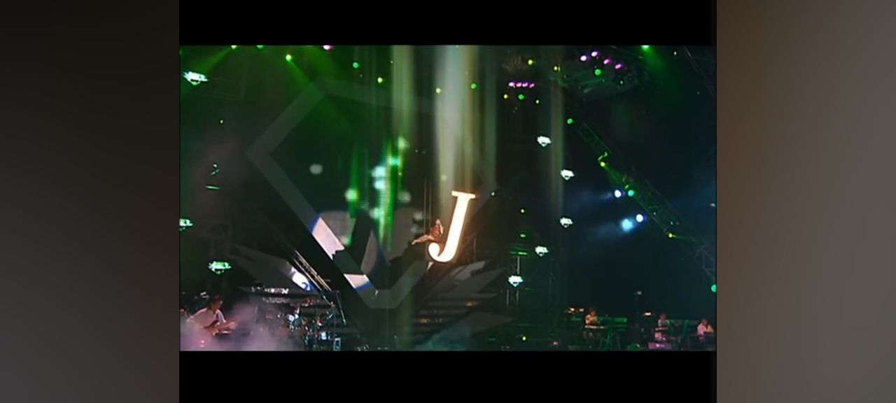 Jolin 有在一個J字造型的掛燈?造景?上唱歌