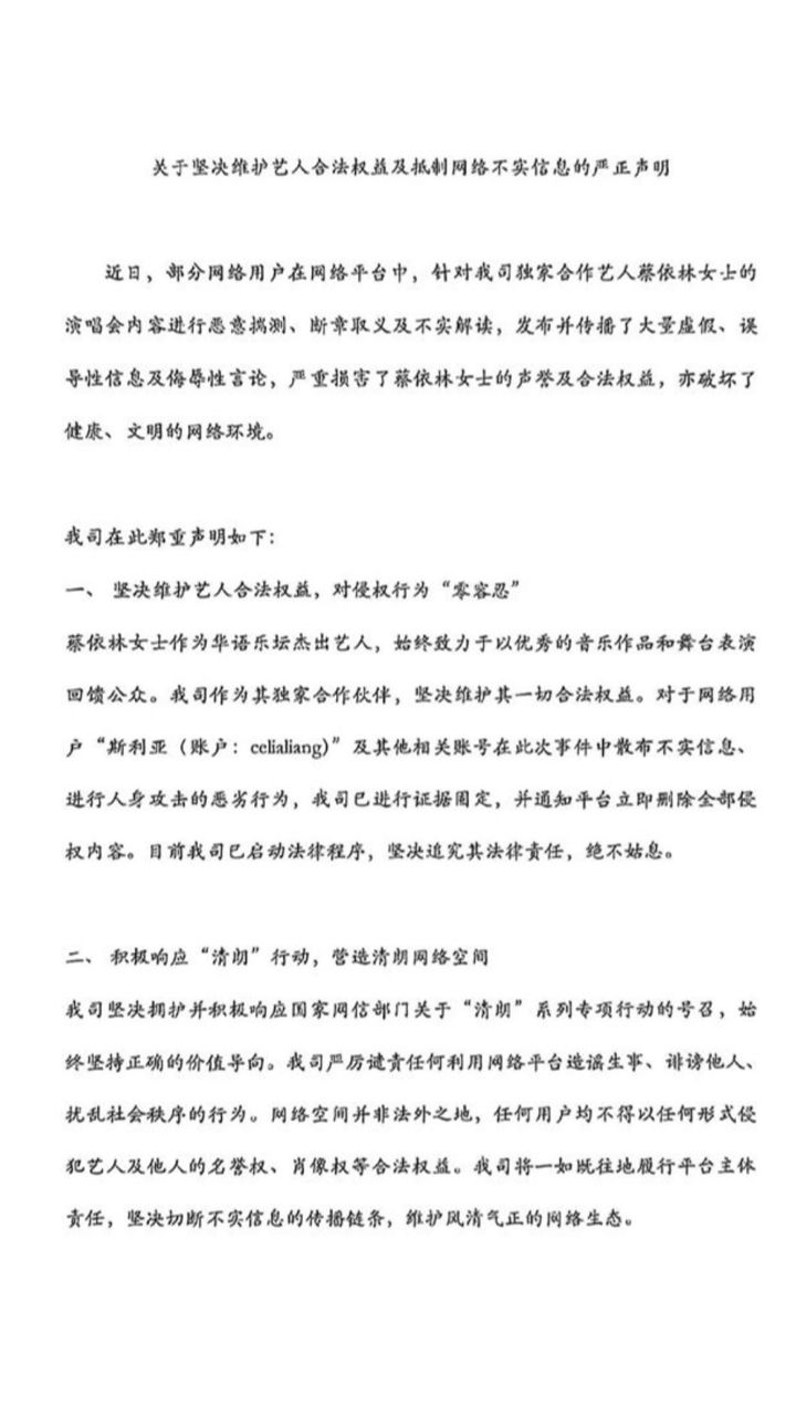 網路用戶惡意揣測演唱會內容、發布虛假訊息及侮辱性言論,將採取法律行動追究責任,