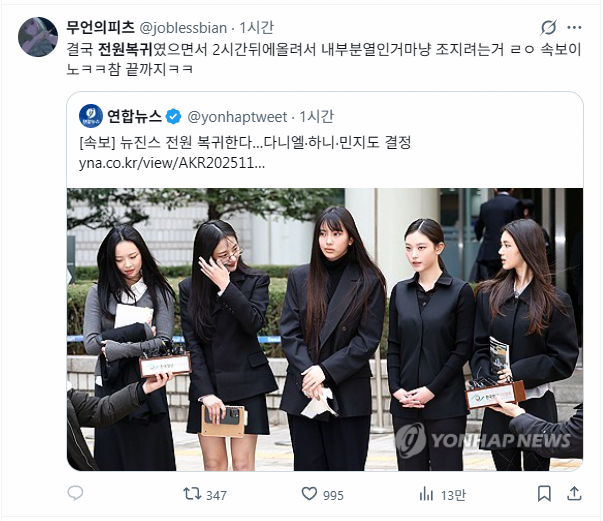 最後,雖然所有NewJeans成員都回歸,但他們卻在兩小時後才上傳影片,