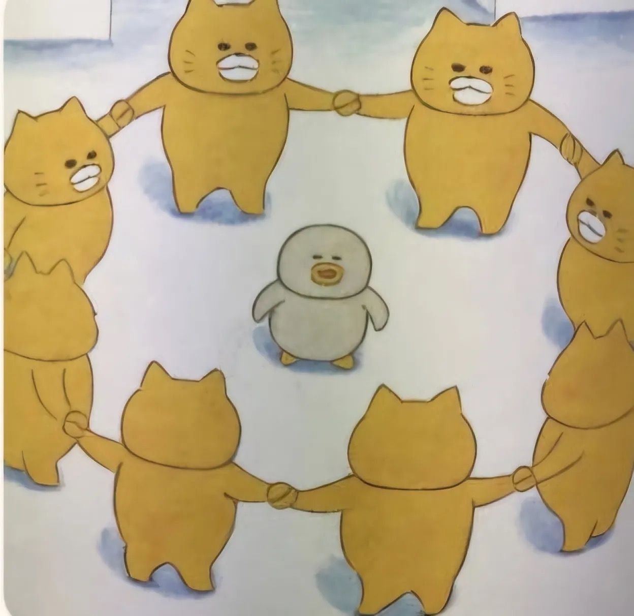 影片裡,保全們像做「強羌水越來」遊戲一樣互相牽著手圍成一圈,將成員們團團圍住,