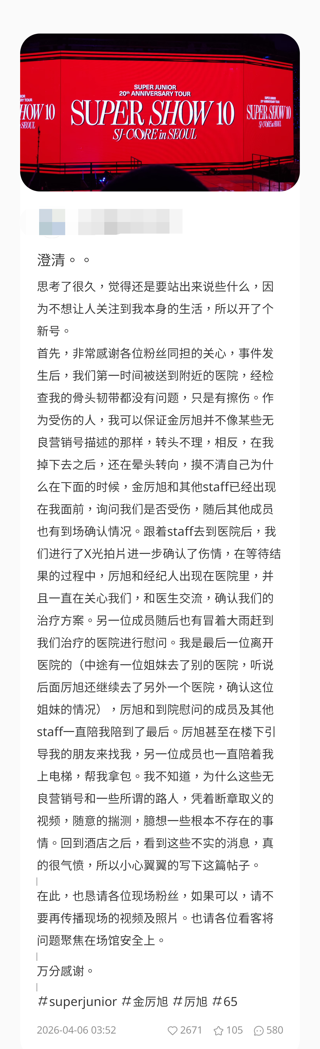 所幸並無大礙。對此,其中一名受傷的粉絲也特別發文,提到厲旭
