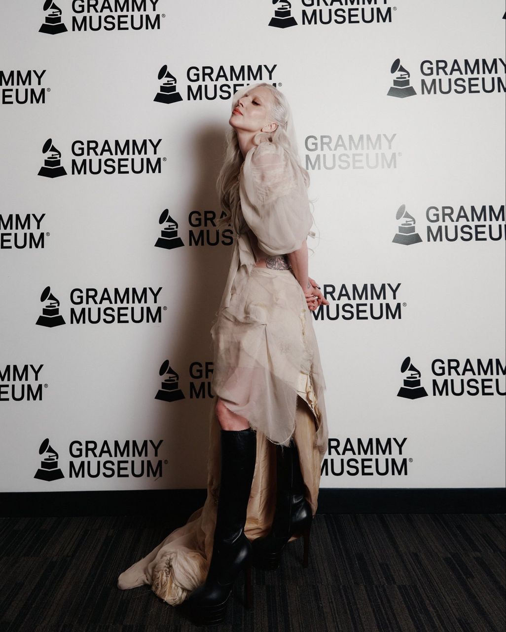 薄紗洋裝,以不規則剪裁與層疊布料呈現破碎美感,下身搭配黑色高筒靴,形成柔與剛的