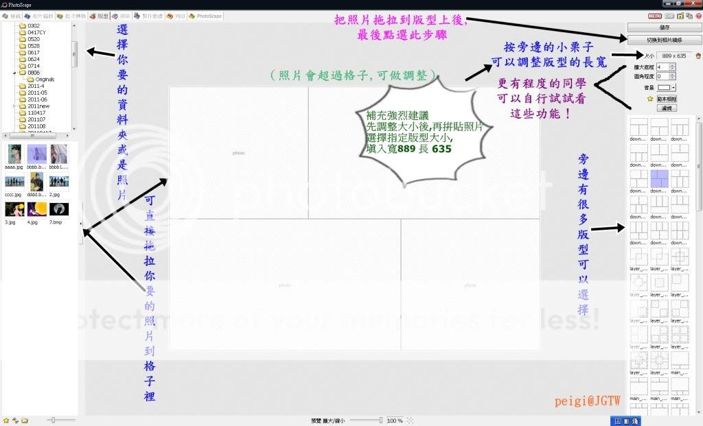 1.當你在photoscape要拼貼圖的時候,記得要先選擇版型的大小(按一下栗子)