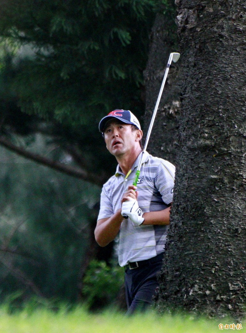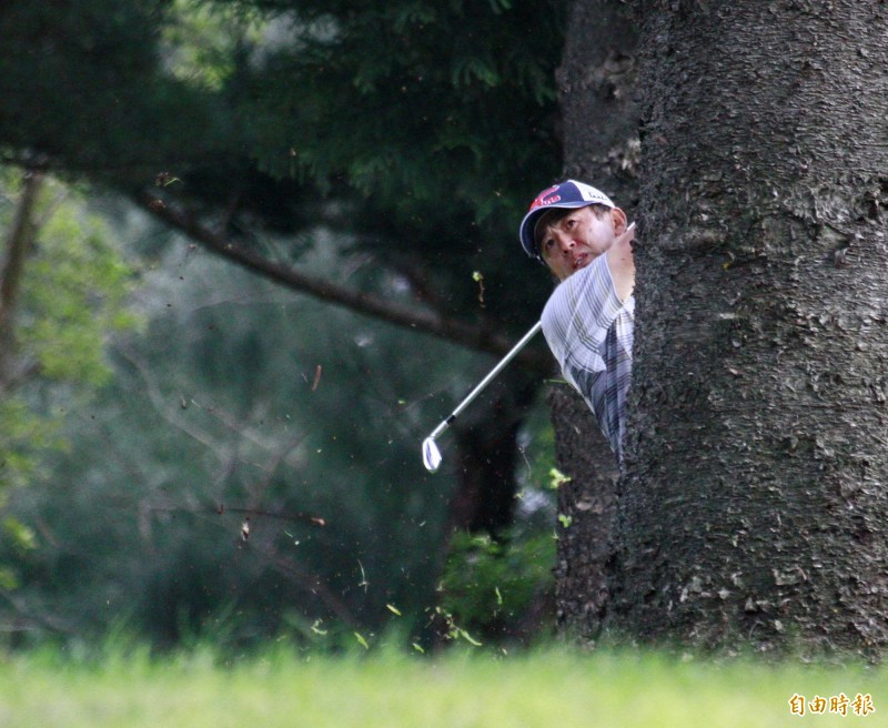 富邦長春公開賽第1回合,鈴木亨在第15洞樹林裡揮桿。(記者趙新天攝)