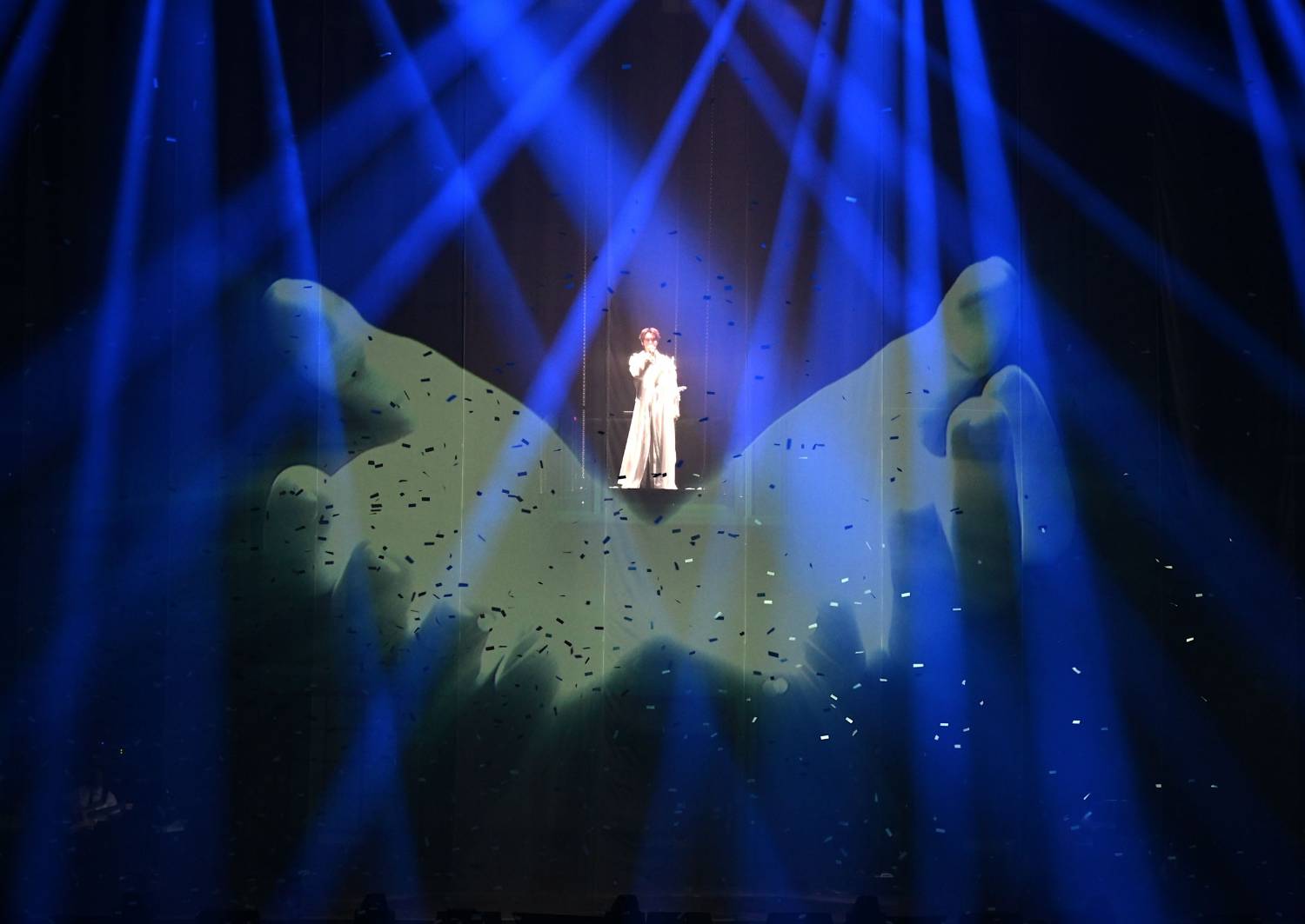 The Dark〉揭開序幕,一身白色西裝搭配羽毛裝飾登場,氣場十足,還不時以中文「大聲