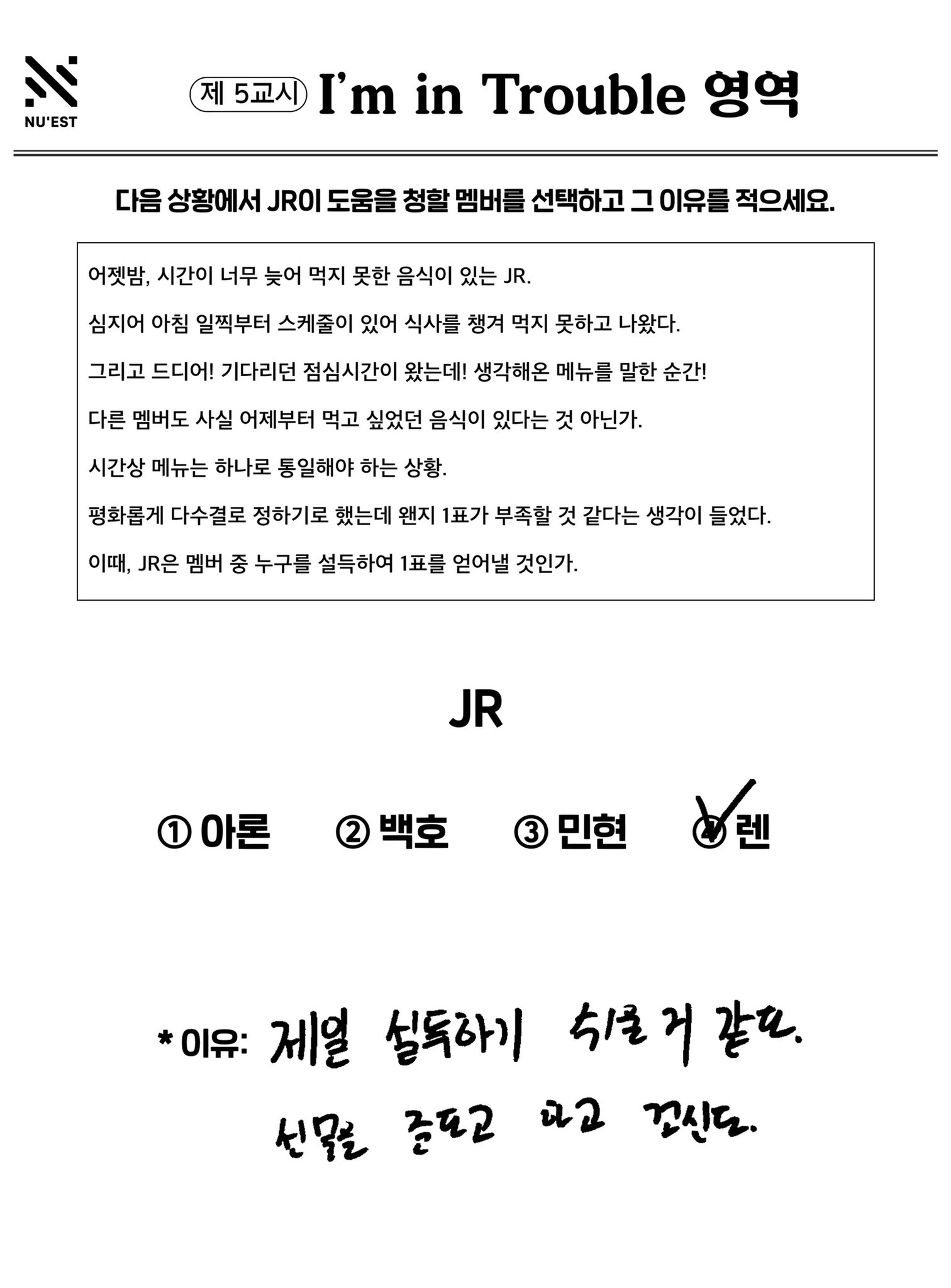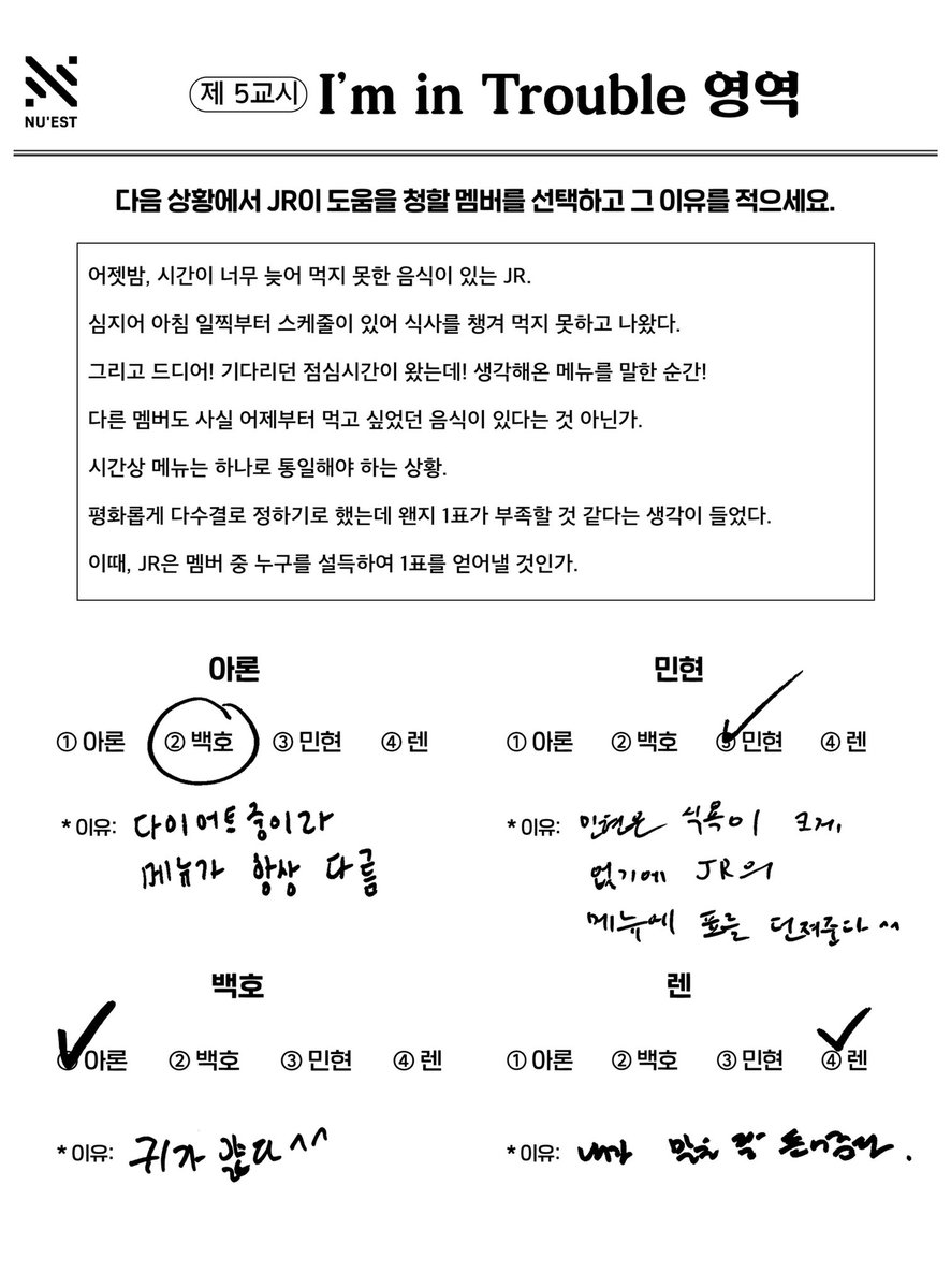 旼炫–旼炫 *原因:因為旼炫沒什麼食貪所以會給JR的菜單一票