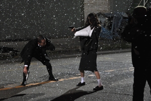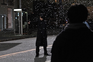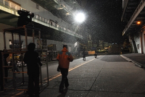 幾台もの雪降らしを用意し…撮影中は当麻・瀬文・ニノマエに雪を降らせながらの撮影