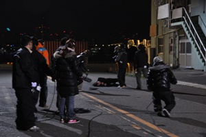 降毒雪的部分也很重要。 在極其寒冷的外景中。猪俣先生、準備中。