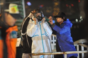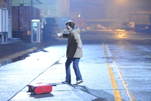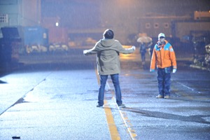 毒入りの雪を降らすのも大変です。寒い寒いロケ中。猪俣さん、準備中。