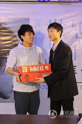 宥嘉還專程帶了兩箱能量飲料送給音像店的工作人員,寓意繼續和大家一起加油,朝著更
